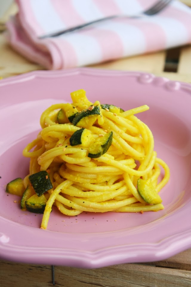Spaghettoni con zucchine e caprino alla curcuma