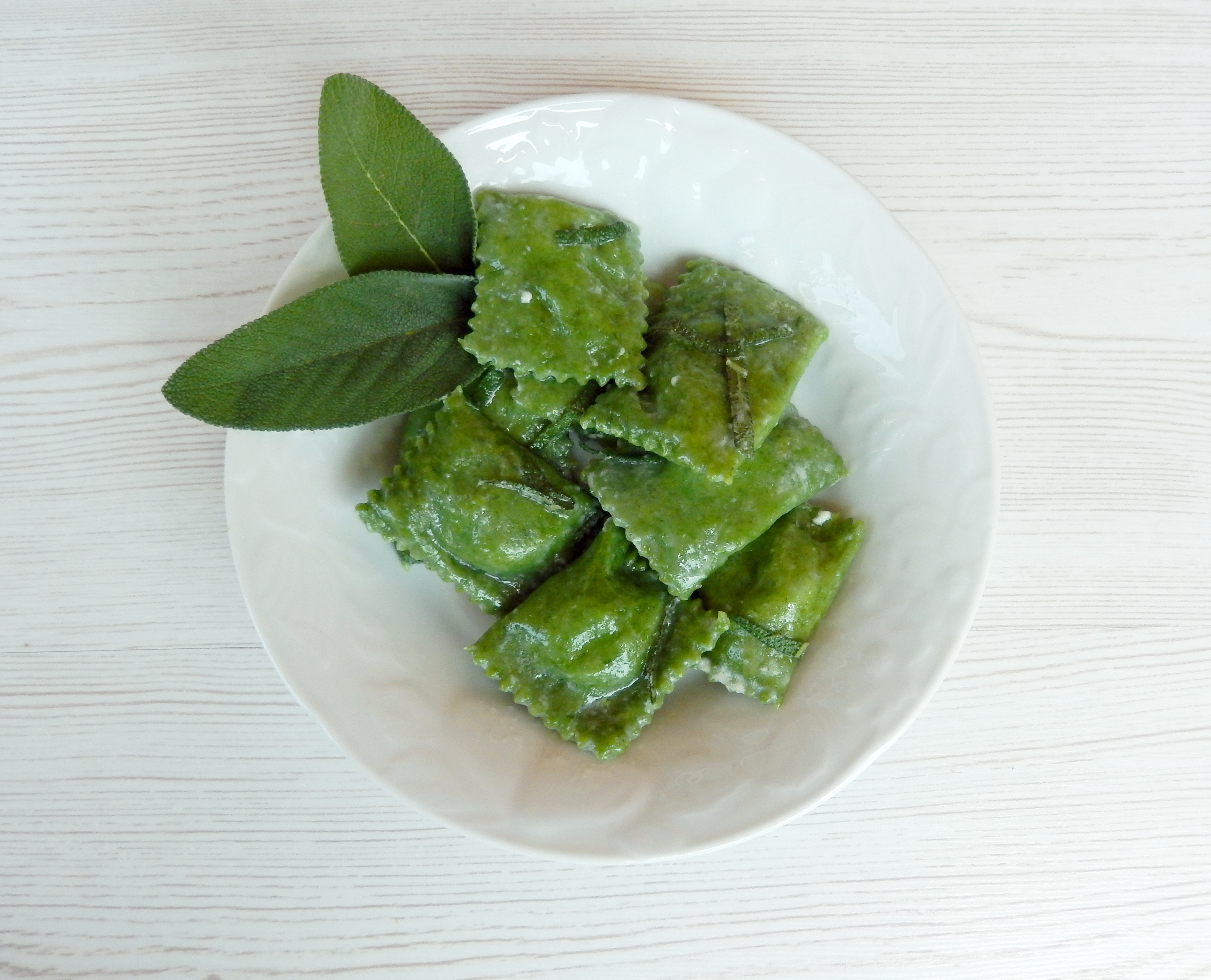 Una colorata alternativa alla solita pasta fatta in casa: ravioli verdi con burro e salvia. Un impasto semplice e tradizionale unito ad un gustoso prodotto di stagione. Il verde della pasta in contrasto con il bianco del ripieno mette subito di buon umore tutti i commensali.