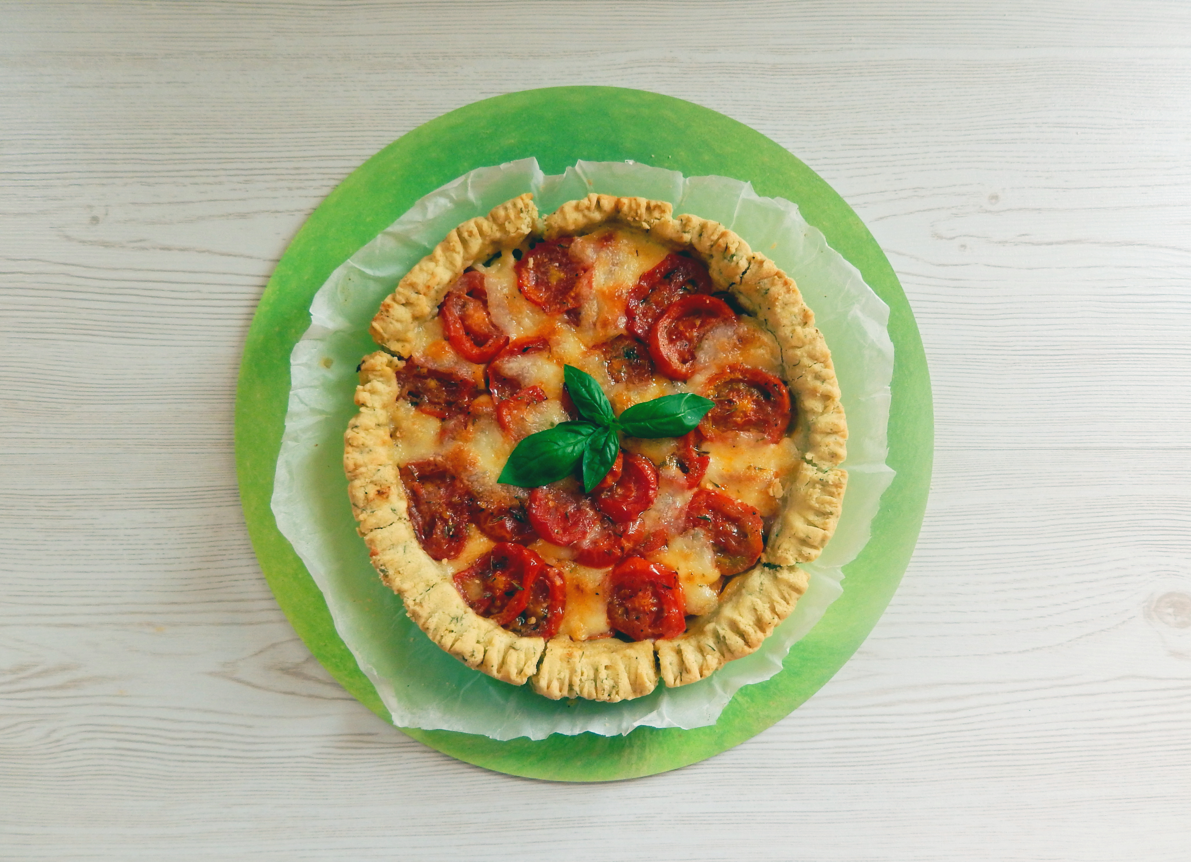 Stendete la pasta posizionandola in una teglia circolare e disponete le fette di pomodoro alternate con quelle di mozzarella, creando piu strati se necessario.