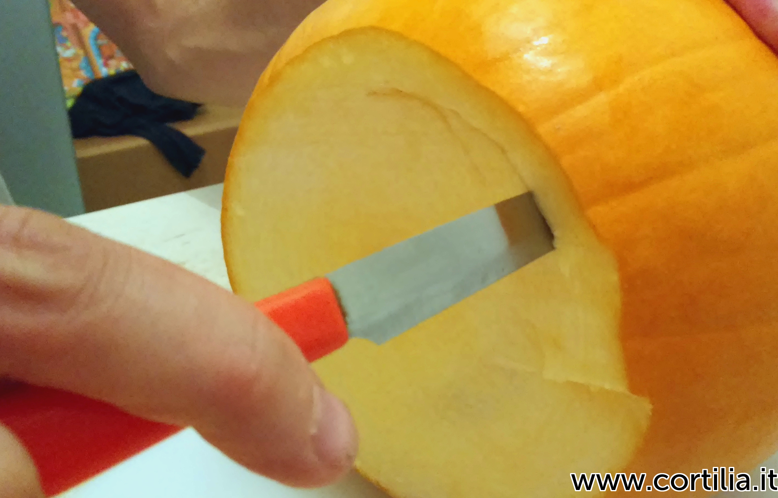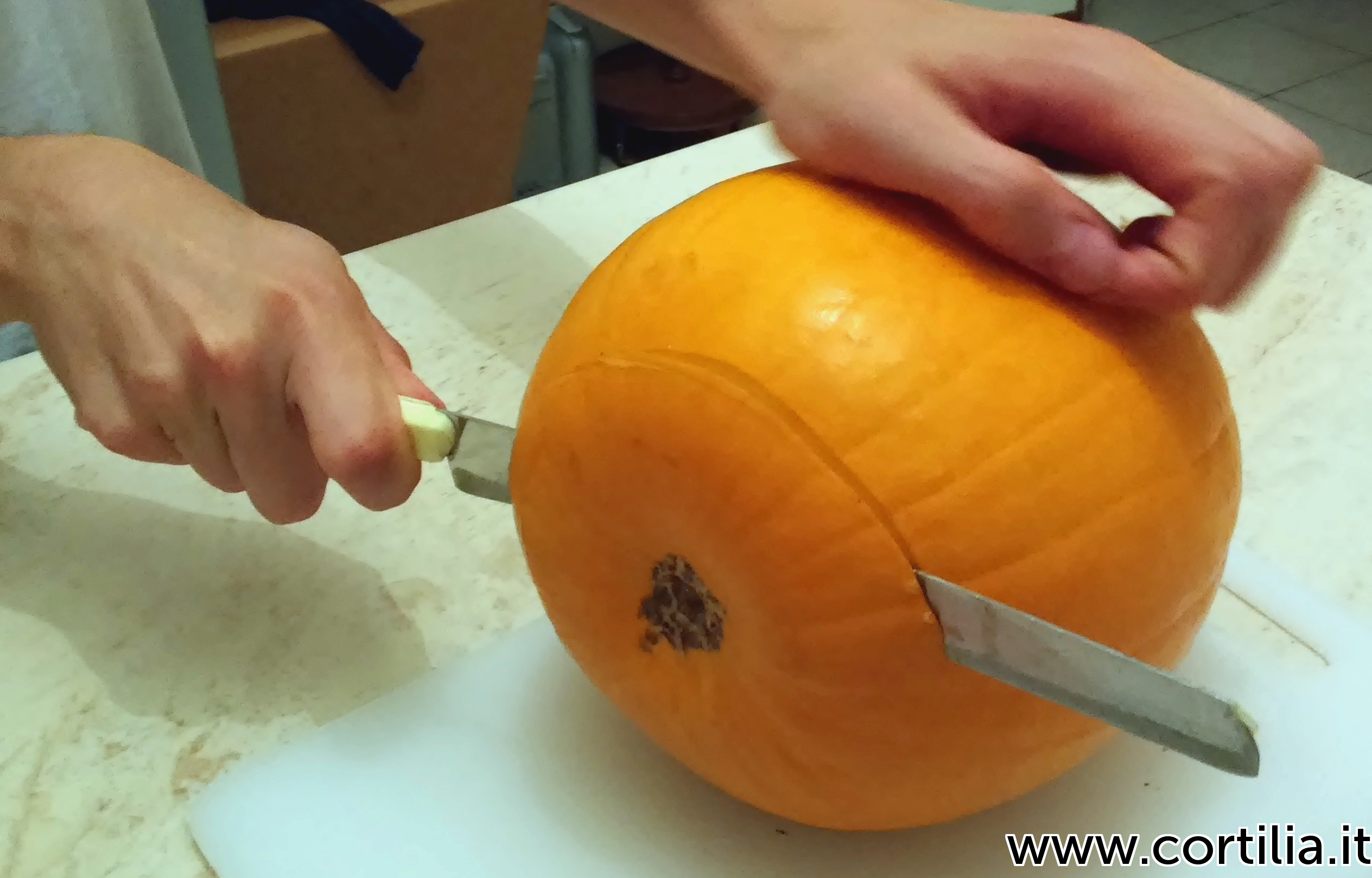 2) Incidete con un coltellino il cuore della zucca in modo da facilitare l’estrazione di polpa e semi.