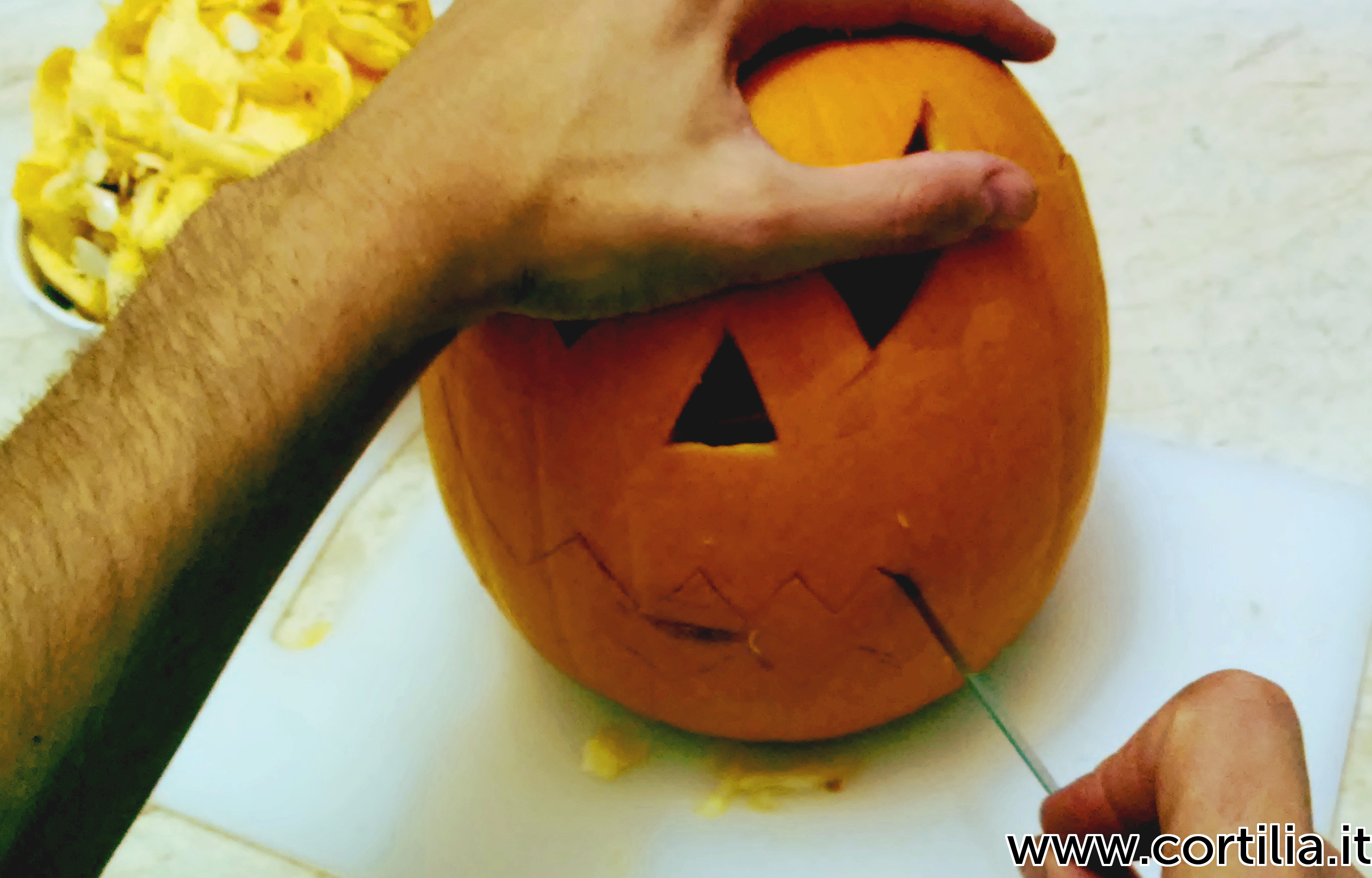 4) Disegnare con l’aiuto di un coltellino o di uno stuzzicadenti occhi, naso e bocca della zucca…. Liberate la vostra fantasia… quindi incidere con un coltello affilato.