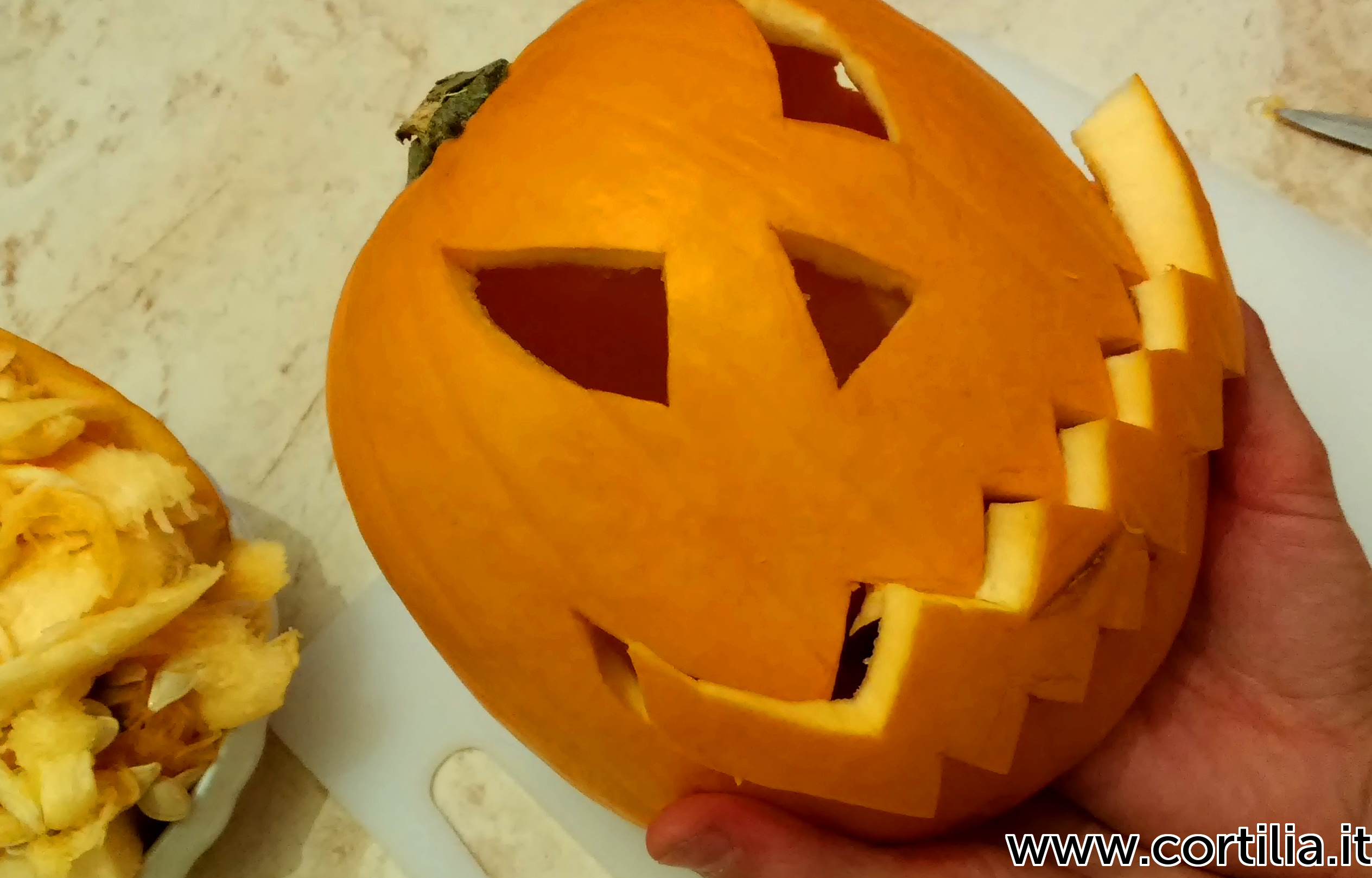 3) A questo punto – anche i più piccoli potranno divertirsi -, con l’aiuto di un cucchiaio, svuotate la zucca, scavando fino in fondo (attenzione a non romperla dato che la buccia è piuttosto morbida).