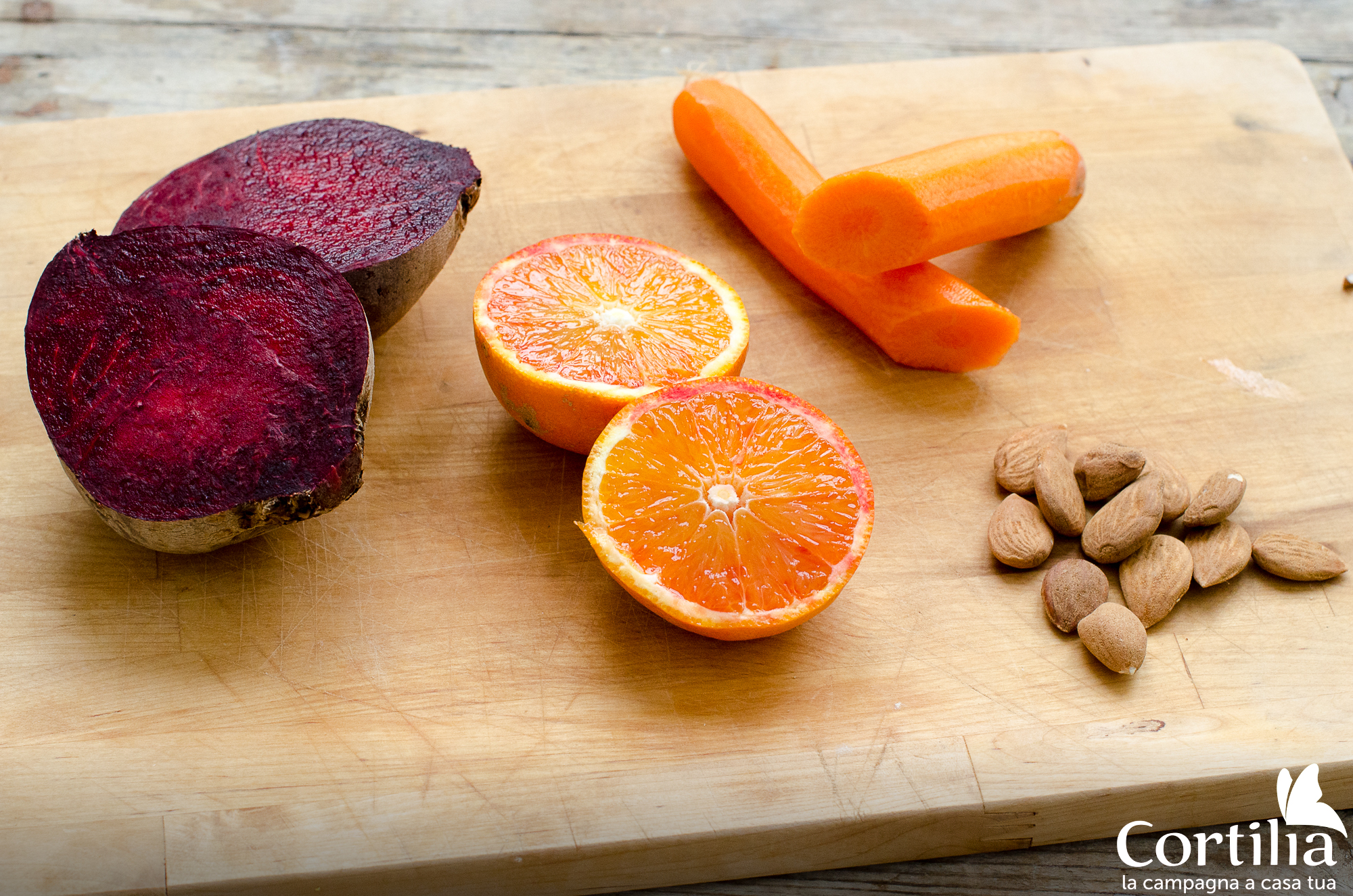 Nel bicchiere del frullatore inserite una mela, un’arancia, una carota e la barbabietola, più 125 ml di latte di mandorla.