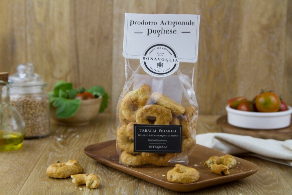 Ed infine approdiamo in Puglia per assaporate i taralli di Bonavoglia. Lavorati a mano e prodotti integralmente seguendo la ricetta tradizionale, sono il risultato dell’incontro riuscito tra i migliori grani pugliesi e l’olio extravergine d’oliva: una meraviglia di friabilità e consistenza perfetti come mordifame a metà mattina o come aperitivo. Questi taralli sono un inno alla pura tradizione, fatti con grano duro tipo 0.