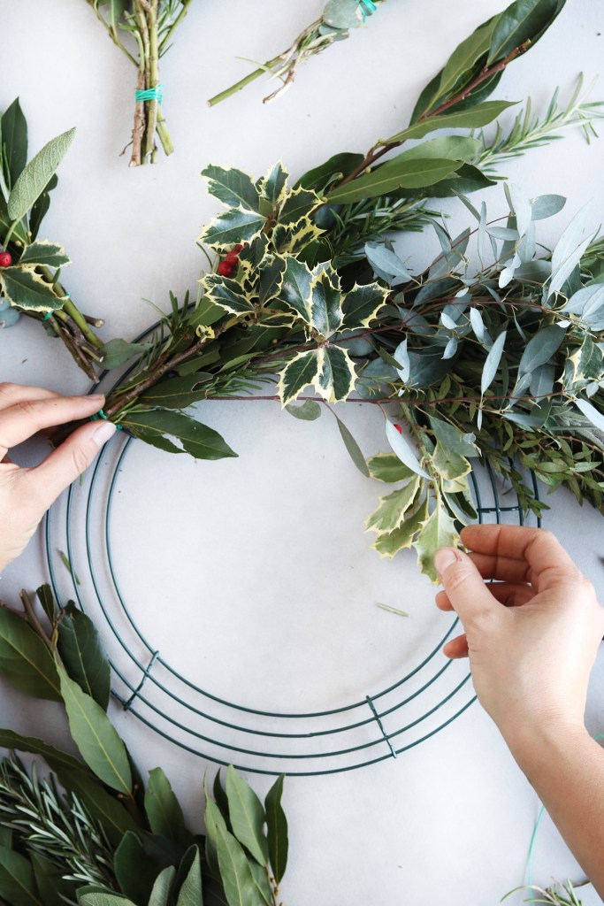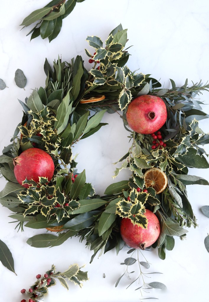 Assicura alla base con il fil di ferro il primo rametto di erba aromatica e prosegui alternando le varietà e inserendo ogni tanto le bacche rosse e un melograno al quale avrai aggiunto una sorta di “gambo” inserendo nella polpa, per circa 2 cm, due stecchini di legno da spiedino distanziati fra loro di circa 1 cm.