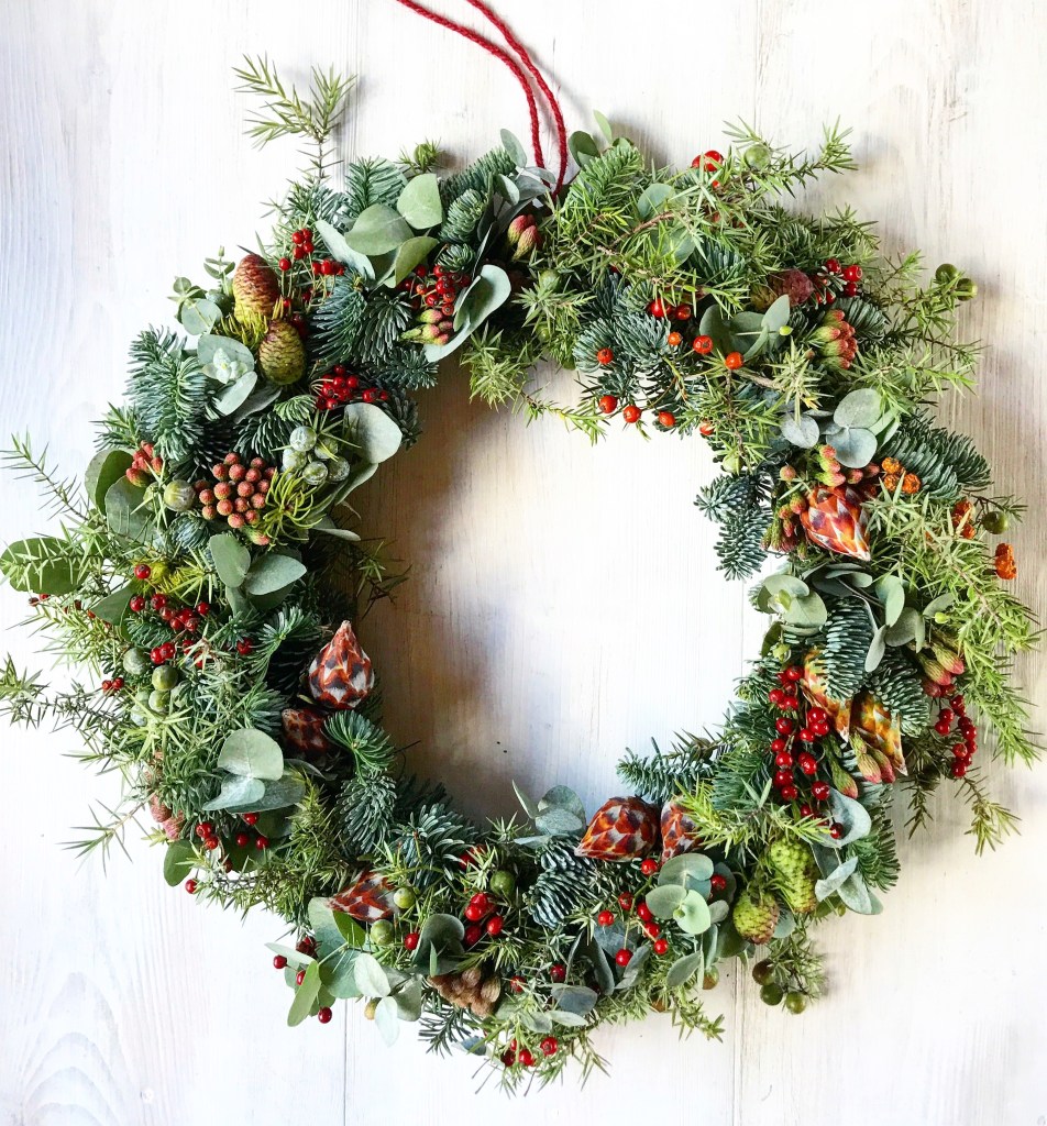 - rametti di pino, bacche rosse e arancioni, agrifoglio, vischio, pigne di diverse dimensioni;