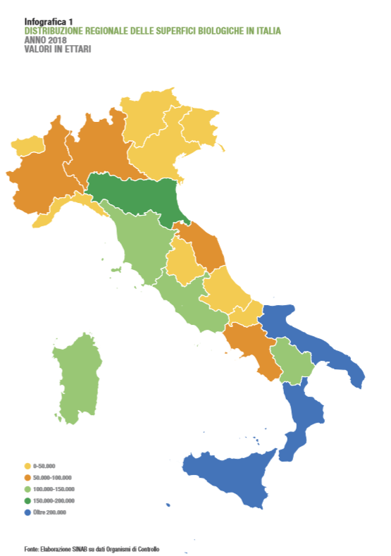 Guardando invece i 3 principali orientamenti produttivi, l’agricoltura biologica rispecchia quella tradizionale: al primo posto si trovano i prati da pascolo (540.012 ha), seguiti dalle colture foraggere (392.218 ha) e dai cereali (326.083 ha). A queste categorie seguono, per estensione, le superfici biologiche investite ad olivo (239.096 ha) e a vite (106.447 ha).