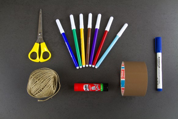 1- Raggruppa un paio di forbici/un taglierino, pennarelli, colla, spago e scotch.