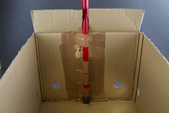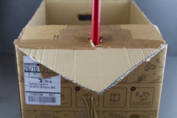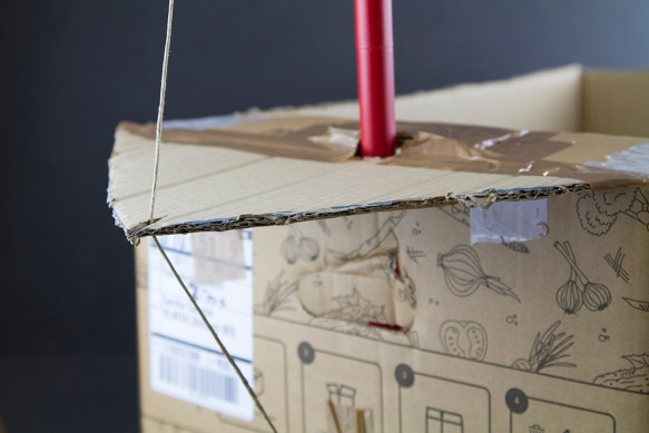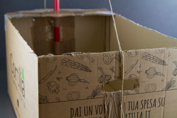 Step 1: Prendi un cartone di Cortilia, appoggialo su uno dei due lati corti con il fondale rivolto verso di te. Disegna con un pennarello nero dei finti comandi (pulsante accensione, spia luminosa, rotella dei gradi)