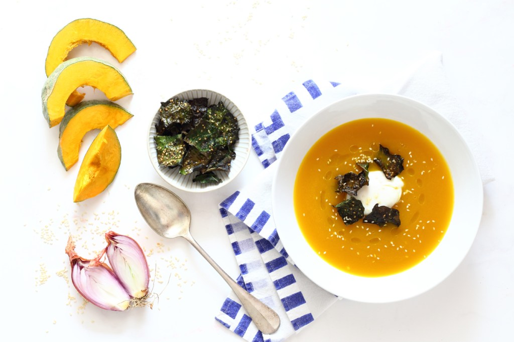 Vellutata di zucca con uovo poché e chips di kale