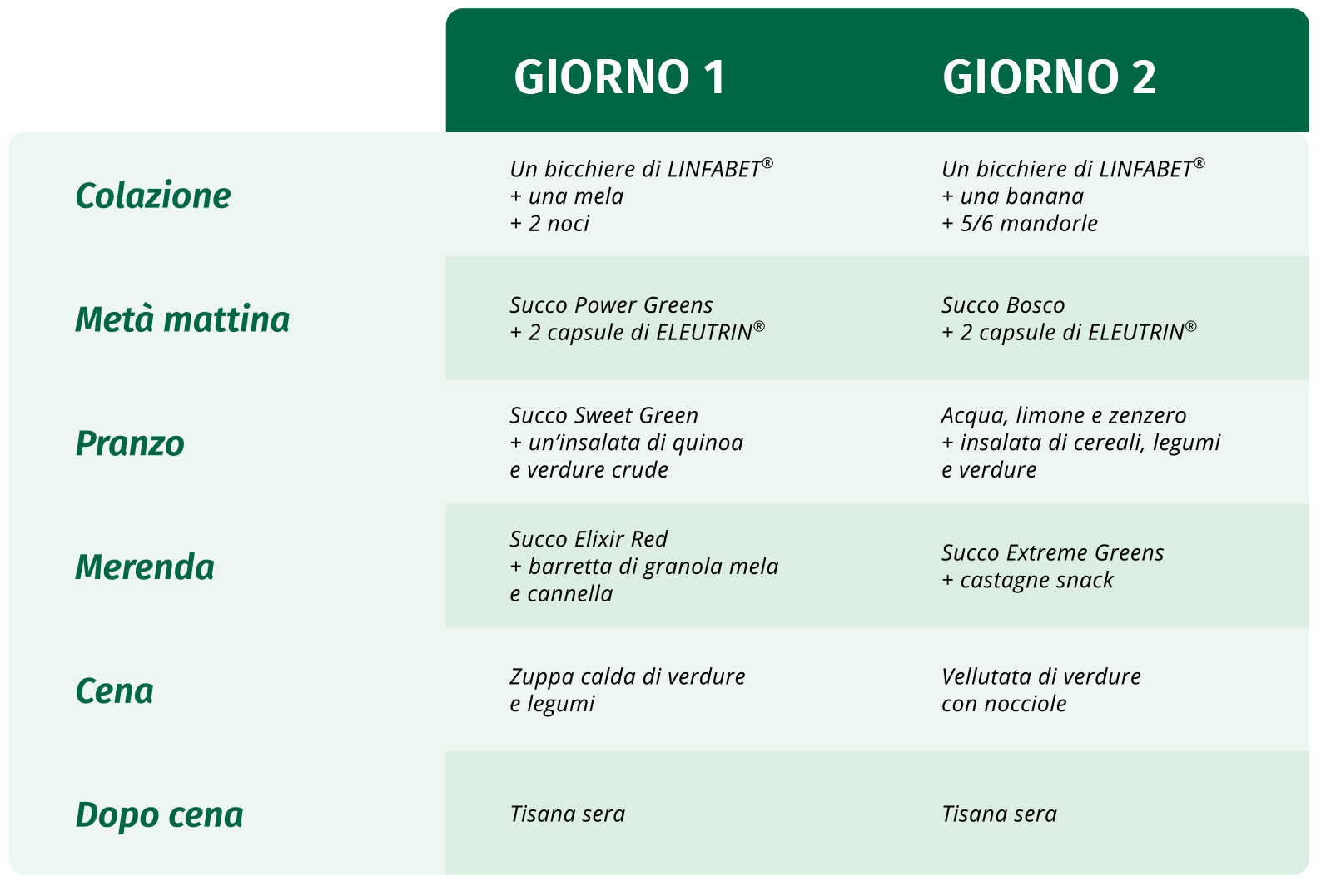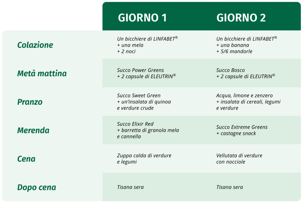 Ti proponiamo di assumere il contenuto del box in un percorso di 2 giorni con 6 appuntamenti al giorno, seguendo questo schema.