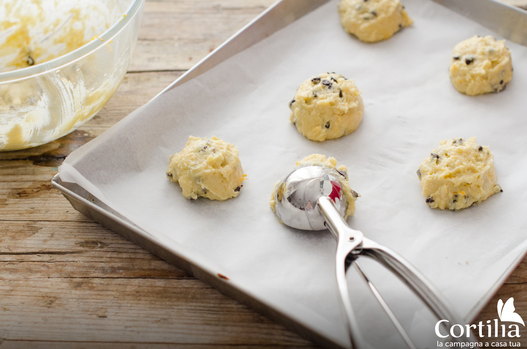 Il trucco per ottenere dei biscotti perfetti, è non eccedere con il lievito e usare un dosatore da gelato per distribuire l’impasto sulla teglia.