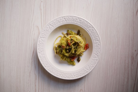 Cuocete gli spaghetti nell’acqua di cottura rimasta e quando saranno al dente scolateli e uniteli al condimento che cuoce in padella. Fate saltare il tutto insieme per un paio di minuti, aggiungete una manciata abbondante di parmigiano grattugiato e servite.