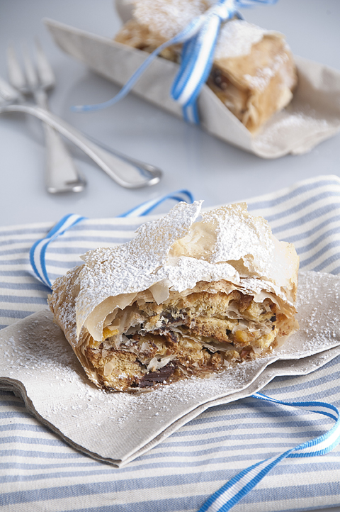 Appoggiare sulla salsa 2 pacchettini e sistemare il fiocco all’incrocio del nastro di porro.