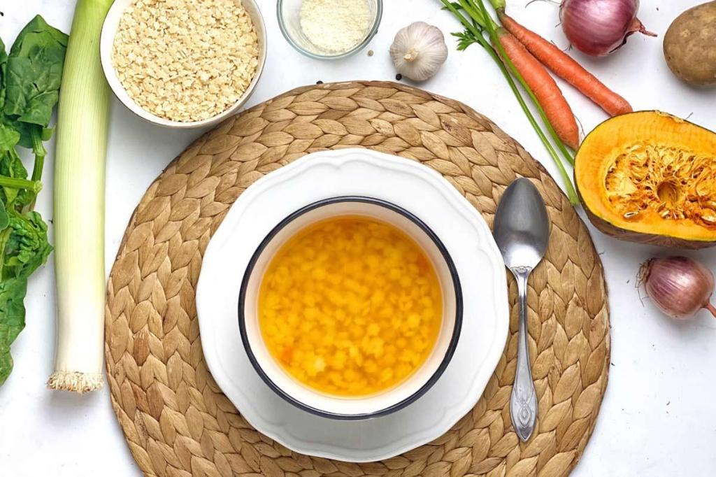 Il kit pastina in brodo colorato. La verdura usata per fare il brodo non va sprecata: si può frullare per ottenere una deliziosa vellutata, da servire a parte condita con olio evo e parmigiano.