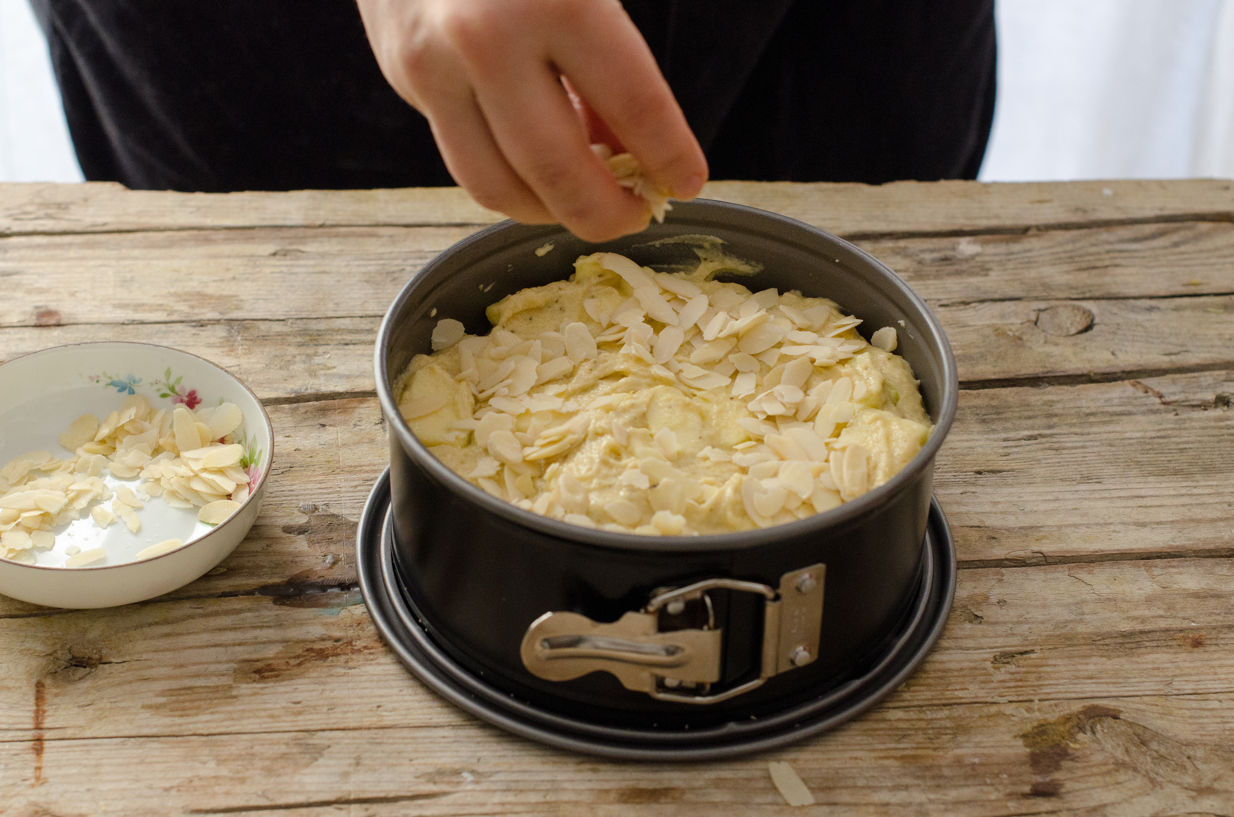 Torta di mele step2Versate l’impasto nella tortiera appena unta, e cospargete la superficie con scagliette di mandorle. Cuocete in forno caldo  per circa 40 minuti.