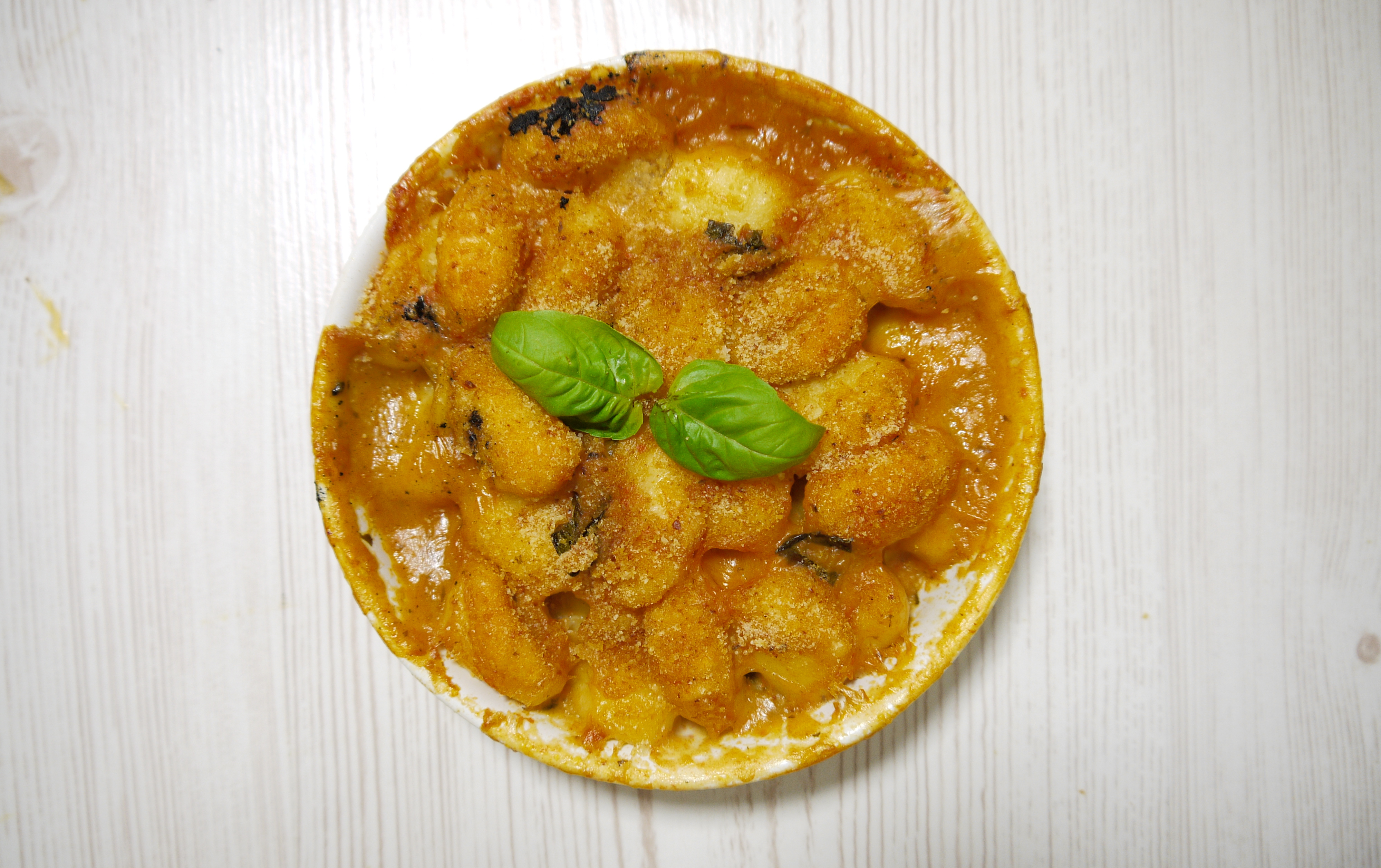 Prendete una pirofila di terracotta e disponete un primo strato di gnocchi, aggiungete quindi la mozzarella (a tocchi o a fette, come preferite), il basilico e di nuovo gli gnocchi. Cospargete con abbondate parmigiano grattugiato e con una manciata di pangrattato. Infornate per 15 minuti a 180 °C con funzione grill e servite ancora filanti.
