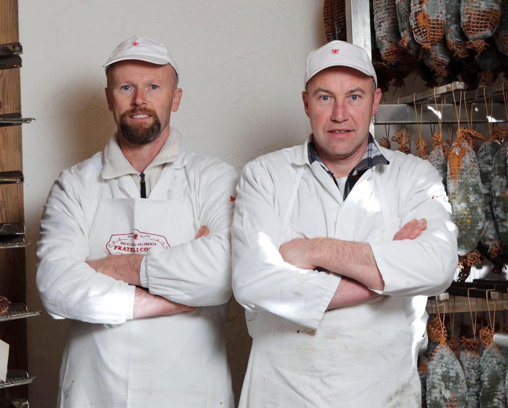 Spostandoci su rocce diverse del nostro territorio montano, troviamo i fratelli Corrà: precisamente in provincia di Trento a Smarano, paese di poco più di 400 anime a circa 1000 metri sul livello del mare, sopra il lago di Santa Giustina. E’ in questo angolo remoto e fuori dal mondo delle montagne del Trentino che ha sede questa storica azienda familiare, dedita da generazioni alla produzione e alla valorizzazione della cultura della norcineria artigianale. Lo speck è l’apripista della tradizione di Pio e Luca, veri e propri portabandiera di questo straordinario salume affumicato che producono, lavorano, stagionano con sapienza e attenzione alla qualità della materia prima.